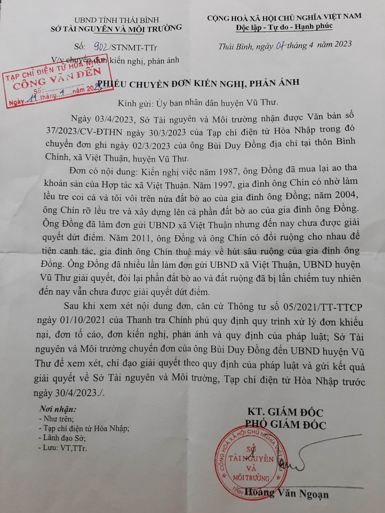 Sau đó, ngày 14/04/2023, Tạp chí điện tử Hòa nhập nhận được văn bản số 902/STNMT-TTr (V/v chuyển đơn kiến nghị, phản ánh) của Sở Tài nguyên và Môi trường, tỉnh Thái Bình do Phó giám đốc Hoàng Văn Ngoạn KT. Giám đốc.