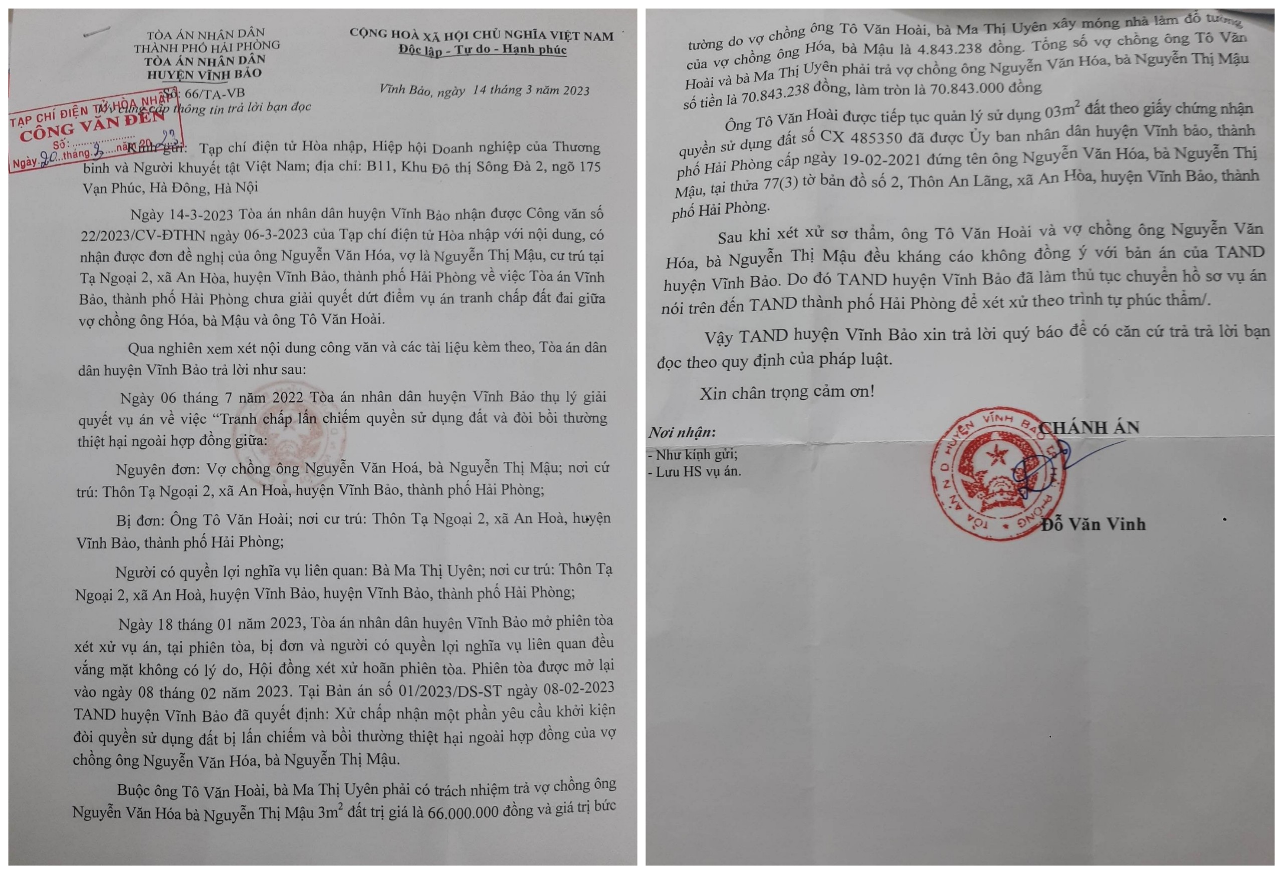 Văn bản số 66/TA-VB có nội dung như sau: “Ngày 14-3-2023 Tòa án nhân dân huyện Vĩnh Bảo nhận được Công văn số 22/2023/CV-ĐTHN ngày 06-3-2023 của Tạp chí điện tử Hòa nhập với nội dung, có nhận được đơn đề nghị của ông Nguyễn Văn Hoá, vợ là Nguyễn Thị Mậu cư trú tại Tạ Ngoại 2, xã An Hoà, huyện Vĩnh Bảo, thành phố Hải Phòng về việc Tòa án Vĩnh Bảo, thành phố Hải Phòng chưa giải quyết được dứt điểm vụ án tranh chấp đất đai giữa vợ chồng ông Hóa, bà Mậu và ông Tạ Văn Hoài.