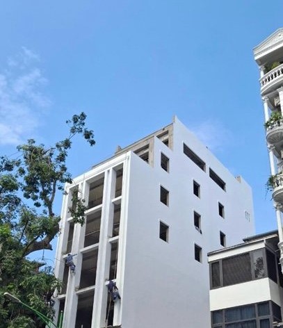 Công trình tại 307 Phố Huế hiện trạng đang là 5 tầng, 1 lửng, 2 tum. 2 tum phía trên kéo dài khoảng 80%, và 65% diện tích mặt sàn tầng dưới, phần lô gia được kéo ra và xây kín thành diện tích phòng sử dụng.