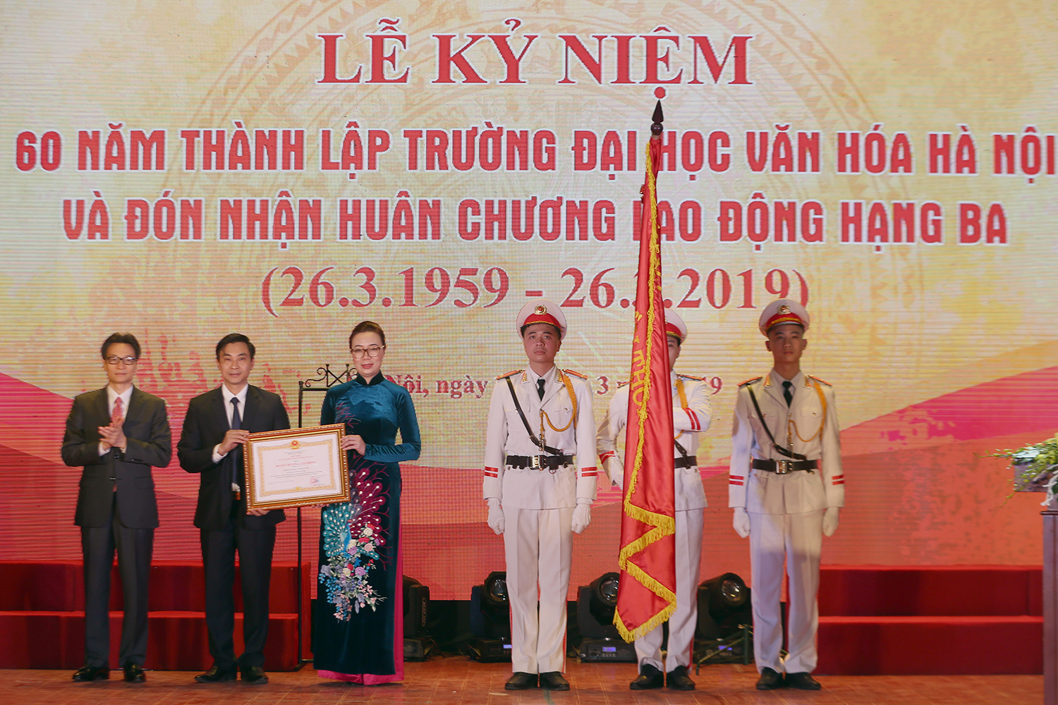 | Thay mặt lãnh đạo Đảng, Nhà nước, Phó Thủ tướng Vũ Đức Đam trao tặng Huân chương Lao động hạng Ba cho Trường Đại học Văn hoá Hà Nội. Ảnh: VGP/Đình Nam |