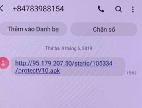 Theo đơn khiếu nại của bà Trang gửi Ngân hàng nhà nước Việt Nam và Ngân hàng VCB, Ngân hàng Techcom Bank, vào khoảng 15 giờ ngày 04/6/2019, điện thoại di động của bà nhận được 1 tin nhắn từ số điện thoại +84783988154. Nội dung tin nhắn chỉ là 1 đường link có ký hiệu: http://95.179.207.50/static/105334/protectV10.apk. Do thiếu cảnh giác và tò mò, bà Trang đã truy cập vào địa chỉ trên. Khi truy cập, màn hình điện thoại hiện ra giao diện có dòng chữ: “Hệ thống bảo vệ Bộ Công an” kèm theo phù hiệu của Bộ Công an rất đẹp, trên đó có 2 mục: “danh sách ngân hàng”, “văn bản” (như trong ảnh).