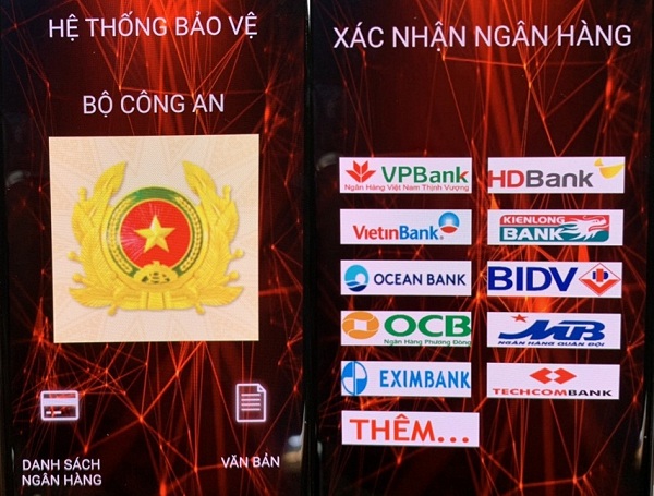 Bà Trang tiếp tục thao tác vào mục: “Danh sách ngân hàng” thì màn hình điện thoại hiện ra logo ngân hàng: VPBank, VietinBank, Ocean Bank, OCB, Eximbank, HDBank, Kienlong Bank, BIDV, MB, Techcom Bank và mục “thêm”. Thao tác tiếp vào mục “thêm” thì màn hình điện thoại của bà Trang hiện ra logo của một số ngân hàng nữa, trong đó có Ngân hàng VCB. Nghĩ đây là phần mềm bảo vệ tài khoản của bộ Công an dành cho các ngân hàng nên bà Trang làm theo một số hướng dẫn và sau đó thoát khỏi ứng dụng.