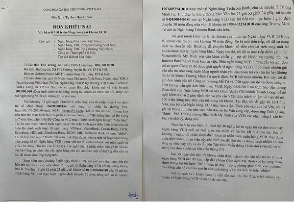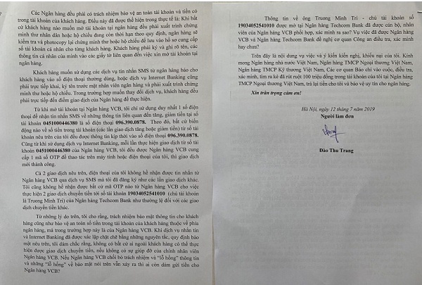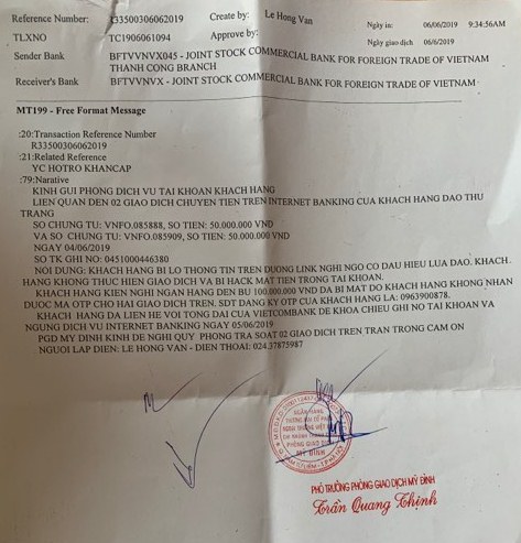 Ngày 06/6/2019 theo hướng dẫn của Công an, bà Trang đến phòng Giao dịch của Ngân hàng VCB tại Mỹ Đình để đề nghị kiểm tra lại 2 giao dịch trên. Tại đây, bà Trang được bà Lê Hồng Vân, cán bộ của Ngân hàng VCB tiếp, làm việc. Theo yêu cầu của bà Vân, bà Trang đã ghi lại thông tin nêu trên vào mẫu đơn do bà Vân cung cấp, được ông Trần Quang Thịnh - Phó Trưởng phòng Giao dịch Mỹ Đình của VCB xác nhận bằng 1 văn bản bản với chữ ký, con dấu.