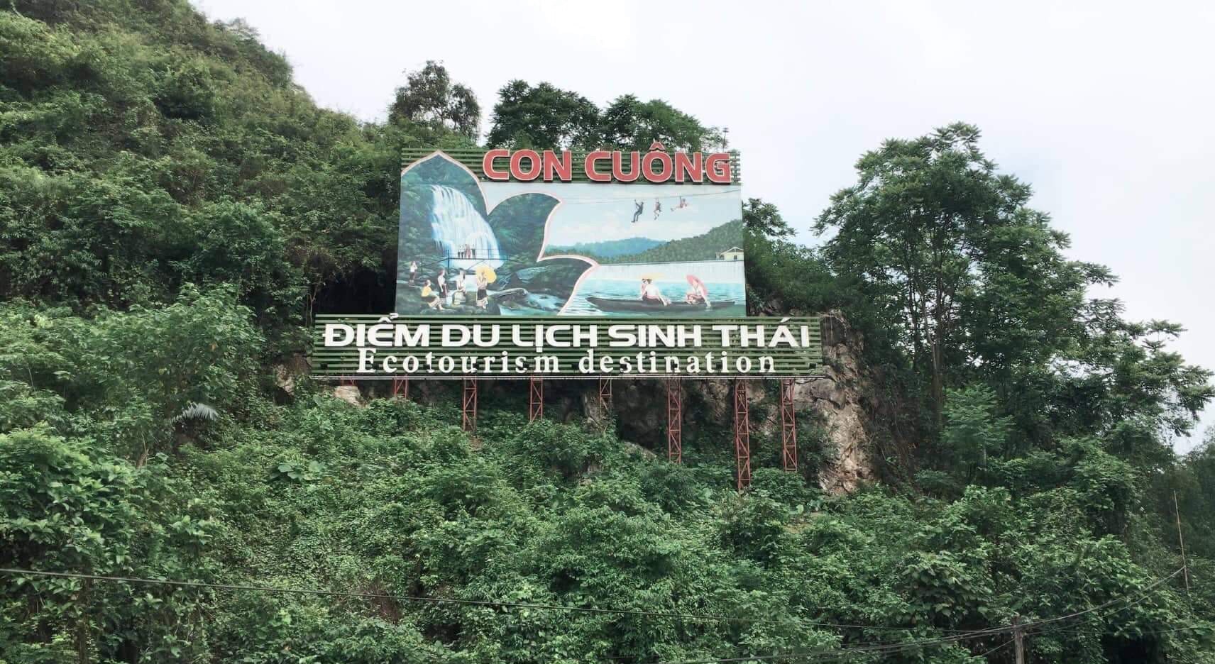 | Thay cho lời chào, lời mời, tấm biển “Con Cuông - Điểm du lịch sinh thái” được đặt trên vách núi càng tăng thêm sự thu hút, tò mò khám phá của du khách. |