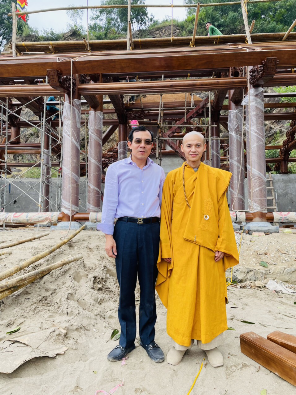 Ông Vũ Quang Bảo, Chủ tịch Tập đoàn BBGRUOP - Nhà công đức chính trong dự án trùng tu, tôn tạo chùa Hổ Sơn chụp ảnh lưu niệm cùng Đại đức Thích Nhẫn Trực, trụ trì nhà chùa trước hạng mục công trình thời điểm đang thi công - Ảnh: Cơ sở cung cấp.