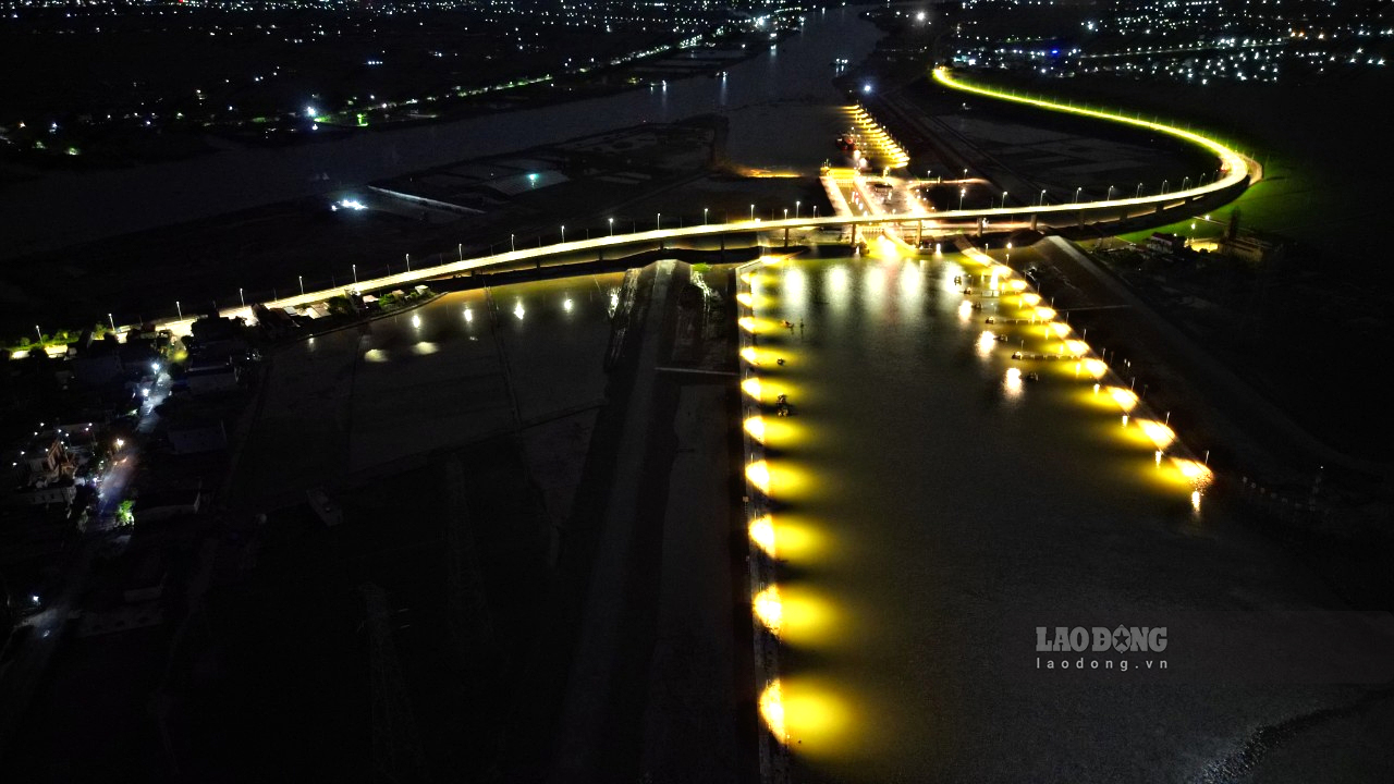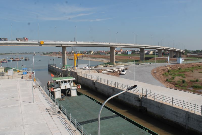 Để thi công xây dựng cụm công trình, một phần đê và tỉnh lộ 490C tại địa phương đã được thay thế bằng cây cầu vượt bê tông cốt thép dài hơn 700m, rộng 17m, chiều cao tĩnh không 15m. Hệ thống chiếu sáng của cụm công trình bao gồm nhiều hạng mục, được thi công kết hợp theo mặt bằng của các hạng mục. Trong đó khu vực âu tàu có tới 9 vùng chiếu sáng với tổng số 86 đèn (gồm 50 đèn 200W, 4 đèn 150W, 32 đèn 60W). Đường gom và cầu vượt có 124 cột đèn mạ kẽm nhúng nóng MDC, chiều cao cột đèn 11m, mỗi cột cách nhau 30m, chiếu sáng bằng đèn Led MDC Titan 125W. Hệ thống chiếu sáng có ba chế độ bật gồm: Bật, tắt thủ công tại phòng điều hành trung tâm, bật tự động theo khung giờ và bật tự động theo cảm ứng ánh sáng. Nhờ có hệ thống chiếu sáng hiện đại này, cụm công trình gồm nhiều hạng mục ở đây luôn rực rỡ ánh đèn trong đêm.