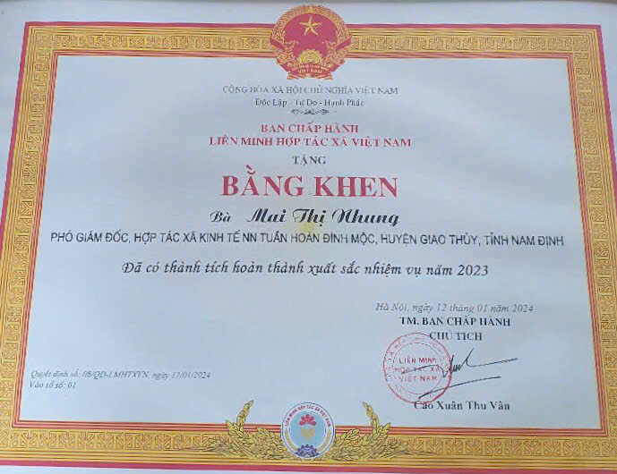 Bà Mai Thị Nhung, Phó Giám đốc HTX Kinh tế nông nghiệp tuần hoàn Đình Mộc đã được Liên minh HTX Việt Nam tặng Bằng khen - Ảnh: Cơ sở cung cấp.