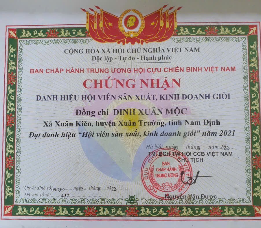 CCB Đinh Xuân Mộc đã được Ban Chấp hành Trung ương Hội CCB Việt Nam trao tặng danh hiệu “Hội viên sản xuất kinh doanh giỏi” năm 2021 - Ảnh: Cơ sở cung cấp.