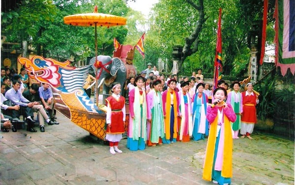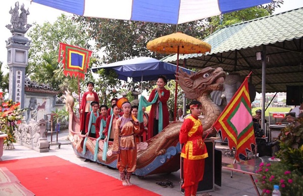 Đặc sắc nhất trong lễ hội là màn hát Chèo tàu với các làn điệu đối đáp giữa hai “tàu” - là những chiếc thuyền rồng bằng gỗ được các thôn chuẩn bị sẵn. Đặc biệt, những con tàu này không được hạ thủy mà chỉ để chèo tượng trưng trên cạn. Mỗi tàu gồm 13 người gồm “bà chúa tàu”, 2 “cái tàu” và 10 “con tàu”. “Bà chúa tàu” khoảng 50 tuổi, phải là người giỏi múa hát, gia đình song toàn. “Cái tàu” và “con tàu” là gái thanh tân từ 13 - 16 tuổi, sinh ra và lớn lên trong gia đình gia giáo, bản thân ngoan ngoãn, hát hay, múa giỏi. Khi biểu diễn, “bà chúa tàu” đánh thanh la, 2 “cái tàu” lĩnh xướng và các “con tàu” hát họa theo. Ngoài ra, hát Chèo tàu không thể thiếu đôi tượng (voi) dựng phía sau mỗi tàu. Mỗi con voi có hai quản tượng là nữ cải trang thành nam.