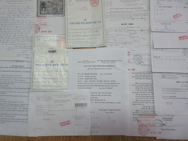 Bộ hồ sơ gồm: 1) Đơn xin chế độ cho 2 cháu nội gửi Cục Người có công ngày 26/2/2018; 2) Sổ Hộ khẩu; 3) Giấy CMND của ông Nguyễn Văn Phượng; 4) Giấy Chứng nhận TB 2/4 của ông Nguyễn Văn Phượng; 5) Quyết định 175/LĐ-TBXH ngày 19/8/1992 của Giám đốc Sở LĐ-TBXH Nghệ An; 6) Quyết định số 5198/LĐTBXH.NCC ngày 26/10/2010 của Sở LĐ-TBXH Nghệ An; 7) Quyết định số 371/QĐ-NCC ngày 07/11/2013 của Sở LĐ-TBXH Nghệ An; 8) Quyết định số 214/QĐ-SD ngày 1/8/2016 của Sư đoàn BB301 thuộc Bộ Tư lệnh Thủ đo Hà Nội; 9) Giấy xác nhận tình trạng bệnh tật của Bệnh viên Nhi Trung ương ký ngày 19/8/2014 xác nhận cháu Nguyễn Thu Trang sinh 30/12/2011; 10) Phiếu Chỉ định kèm Biên lai thu tiền của Bệnh viện nhi TW cấp cho cháu Nguyễn Tiến Nam sinh 2015; 11) Phiếu kết quả chụp X-Quang của cháu Nguyễn Tiến Nam do BV Nhi TW cấp ngày 20/6/2015; 12) Phiếu kết quả xét nghiệm của của cháu Nguyễn Tiến Nam do BV Nhi TW cấp ngày 25/7/2017.