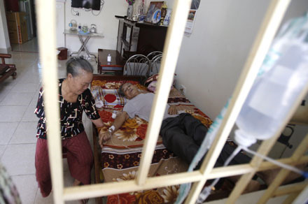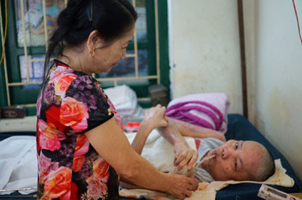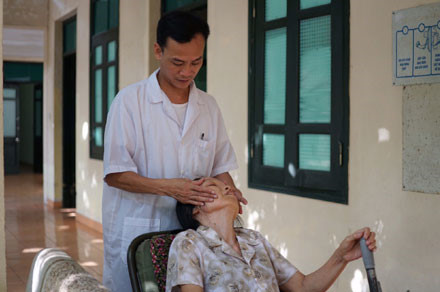 Bác sĩ Ngô Huy Phô đang chăm sóc cho thương binh Nguyễn Thị Thoa, quê Hà Nội, sinh năm 1952, sống độc thân.