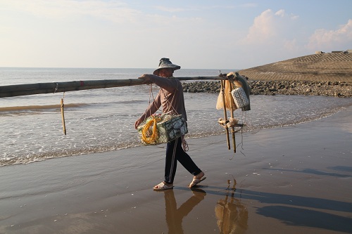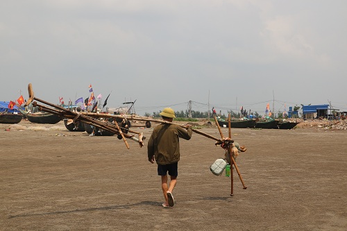 | Hình ảnh ngư dân cùng đôi cà kheo là nét đặc trưng của vùng biển Hải Hậu. |