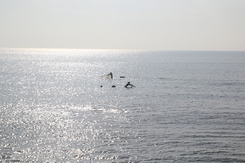 | Trên những đôi kheo, ngư dân nhấp nhô ngoài khơi xa. |