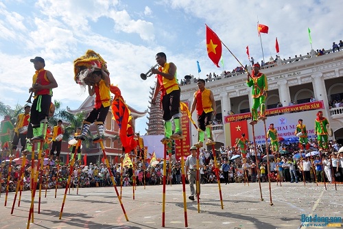 Trên những đôi kheo cao 2-4 mét, các đội biểu diễn múa lân, múa rồng, đánh trống, thổi kèn,… thật điêu luyện và tài tình, tạo không khí vui tươi, sôi động cho ngày lễ lớn của quê hương. Mỗi đội có một màn trình diễn riêng, một nét độc đáo riêng nhưng tựu chung lại, họ gặp nhau ở dấu ấn đặc trưng vùng miền, thể hiện nét tài hoa, sáng tạo, yêu đời và tinh thần kiên cường vươn lên của người dân vùng sóng biển.