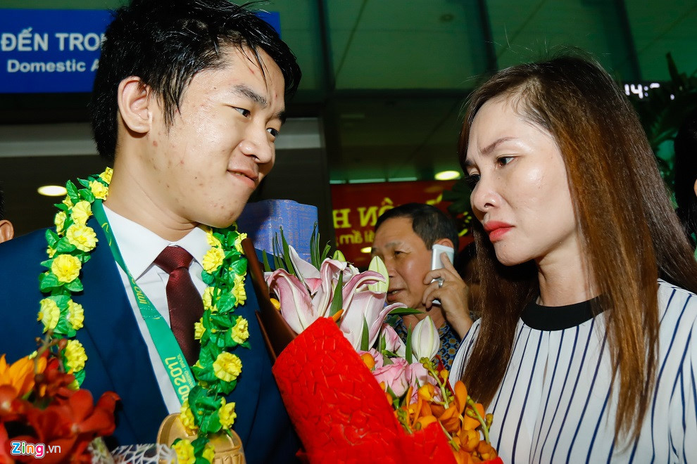 Bà Lê Thị Hương xúc động khi đón con trai trở về Việt Nam. Huy là thí sinh giành điểm cao nhất kỳ thi Toán quốc tế lần này, cùng với hai bạn nước ngoài khác. Ảnh: Hải An.