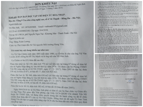 Ngày 04/6/2018 tôi là Vũ Như Anh phải có đơn tố cáo bà Ban chức vụ Giám đốc và ông Thực Phó giám đốc Văn phòng cấp Giấy GCN-QSDĐ Chi nhánh Yên Mỹ thuộc Sở TNMT tỉnh, lợi dụng chức quyền trong khi thi hành công vụ đã tổ chức chiếm đoạt thửa đất 671 của cụ Vũ Văn Chiêm. Đồng thời tôi đề nghị Ủy ban Tỉnh Hưng Yên chỉ đạo cơ quan chức năng cấp GCN cho ba thửa đất nêu trên theo quy định của pháp luật;