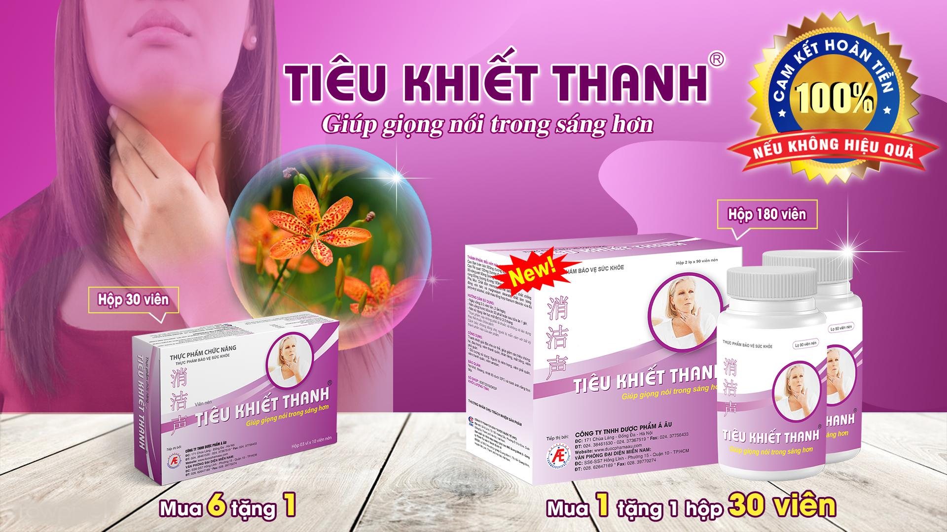 Thực phẩm bảo vệ sức khỏe Tiêu Khiết Thanh - Giữ gìn sự trong sáng của giọng nói Tiêu Khiết Thanh là sản phẩm được kết hợp từ các loại thảo dược như: Rẻ quạt, bán biên liên, bồ công anh, sói rừng. Sản phẩm có công dụng: Thanh nhiệt, giúp giảm các triệu chứng: Ho, đau họng, viêm thanh quản, khản tiếng, mất tiếng; Dùng cho người bị viêm họng, khản tiếng, mất tiếng, viêm thanh quản. Tiêu Khiết Thanh là một lựa chọn mới cho mọi người trong trường hợp khản tiếng, mất tiếng, giúp giọng nói trong sáng hơn. Theo khảo sát của Tạp chí Kinh tế Việt Nam, có đến 90,8% người tiêu dùng hài lòng về hiệu quả cải thiện khản tiếng, mất tiếng, viêm thanh quản… khi sử dụng sản phẩm Tiêu Khiết Thanh.