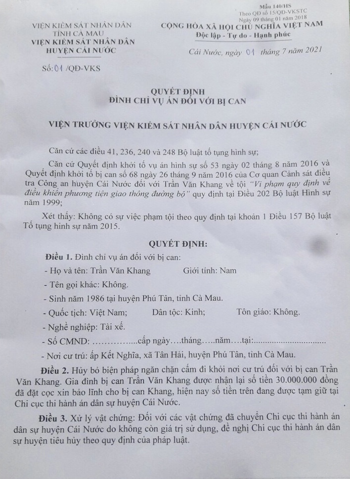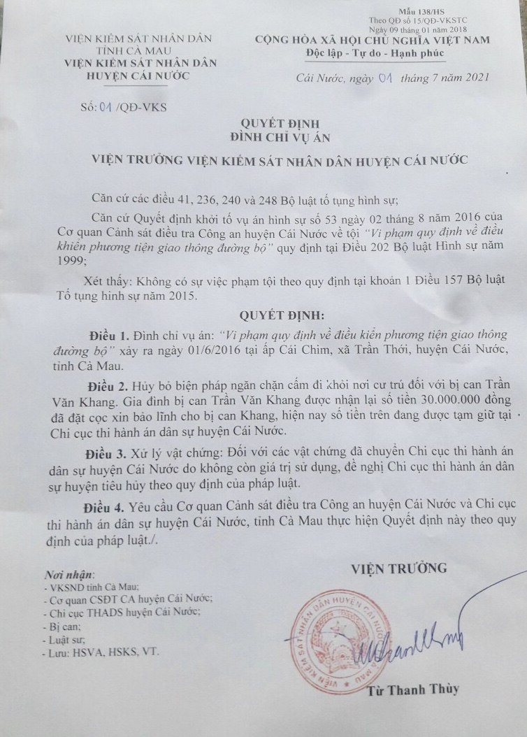 Sau 6 lần rút hồ sơ để điều tra nhưng Viện KSND huyện Cái Nước vẫn chưa đưa ra được các bằng chứng thuyết phục, chứng minh bị cáo Trần Văn Khang phạm tội Vi phạm các quy định về điều khiển phương tiện giao thông đường bộ. Vì vậy, ngày 1/7/2021, Viện trưởng Viện KSND huyện Cái Nước ban hành 2 Quyết định đều mang số 01/QĐ-VKS có nội dung: Căn cứ Quyết định khởi tố vụ án hình sự số 53 ngày 2/8/2016 của Cơ quan CSĐT Công an huyện Cái Nước về tội “Vi phạm quy định về điều khiển phương tiện giao thông đường bộ” quy định tại Điều 202 Bộ luật Hình sự năm 1999. Xét thấy: Không có sự việc phạm tội theo quy định tại khoản 1Điều 157 Bộ luật tố tụng Hình sự năm 2015. Viện KSND huyện Cái Nước quyết định: Đình chỉ vụ án “ Vi phạm quy định về điều khiển phương tiện giao thông đường bộ” xảy ra ngày 1/6/2016 tại ấp Cái Chim, xã Trần Thới, huyện Cái Nước, tỉnh Cà Mau. Hủy bỏ biện pháp ngăn chặn cấm đi khỏi nơi cư trú đối với bị can Trần Văn Khang.