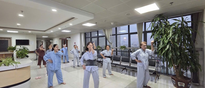 Các bệnh nhân điều trị nội trú tại Khoa A30 vui vẻ tập thể dục buổi sáng