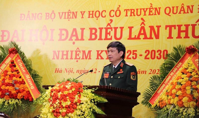 Thiếu tướng, PGS. TS. Phạm Xuân Phong - Bí thư Đảng ủy, Giám đốc Viện Y học cổ truyền Quân đội trình bày báo cáo chính trị tại Đại hội Đại biểu Đảng bộ Viện Y học cổ truyền Quân đội lần thứ XVI nhiệm kỳ 2025-2030