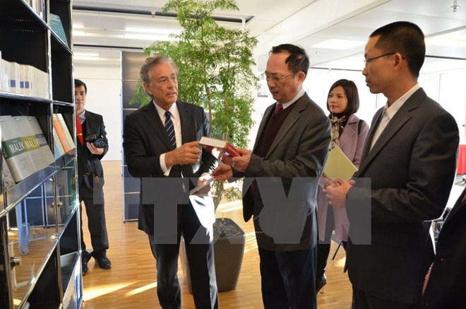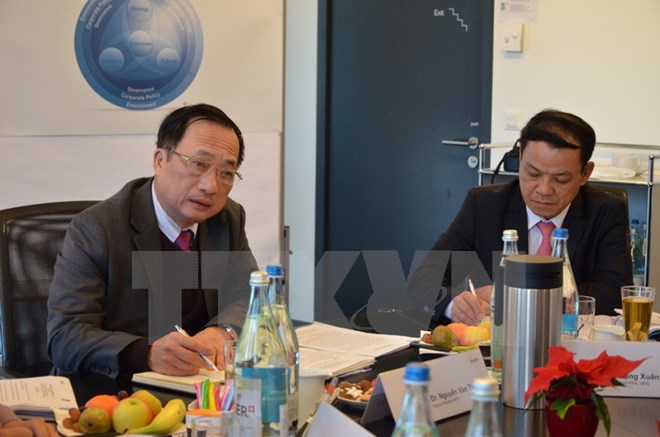 Giáo sư, tiến sỹ Fredmund Malik, người sáng lập và là Chủ tịch điều hành Viện Nghiên cứu và Tư vấn về quản trị Malik (bên trái) giới thiệu về Viện Malik với Thượng tướng Nguyễn Văn Thành, Thứ trưởng Bộ Công an (giữa). (Ảnh: Hoàng Hoa/TTXVN)