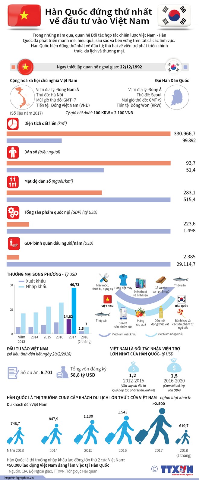 Tính lũy kế đến tháng 10/2018, trong tổng số 128 quốc gia và vùng lãnh thổ có dự án đầu tư còn hiệu lực tại Việt Nam, Hàn Quốc đứng thứ nhất, có 7.323 dự án còn hiệu lực với tổng vốn đăng ký 62,1 tỷ USD (chiếm 18,3% tổng vốn đầu tư). Trong 10 tháng đầu năm 2018, Hàn Quốc đứng thứ 2/104 quốc gia và vùng lãnh thổ có dự án đầu tư tại Việt Nam với vốn đăng ký 6,5 tỷ USD, chiếm 23,4% tổng vốn đầu tư. Trong đó có dự án nhà máy sản xuất polypropylene và kho ngầm chứa khí dầu mỏ hóa lỏng tại Việt Nam với vốn đầu tư 1,2 tỷ USD do tập đoàn Hyosung đầu tư tại Bà Rịa-Vũng Tàu. Hàn Quốc đã đầu tư vào 19 lĩnh vực, chủ yếu là công nghiệp gia công, chế tạo, bất động sản, xây dựng… tập trung nhiều vào một số địa phương như: Bắc Ninh, Hà Nội, Đồng Nai, Hải Phòng và Thái Nguyên.