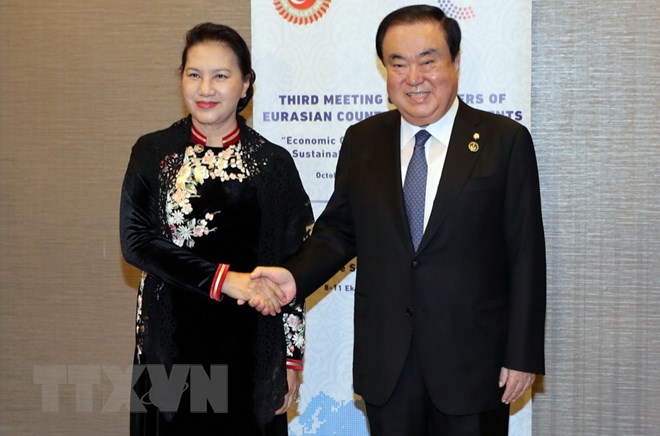 Chủ tịch Quốc hội Nguyễn Thị Kim Ngân hội kiến Chủ tịch Quốc hội Hàn Quốc Moon Hee-sang, bên lề Hội nghị Chủ tịch Quốc hội các nước Á-Âu lần thứ ba (MSEAP 3), tháng 10/2018 ở Antalya (Thổ Nhĩ Kỳ). (Ảnh: Trọng Đức/TTXVN)