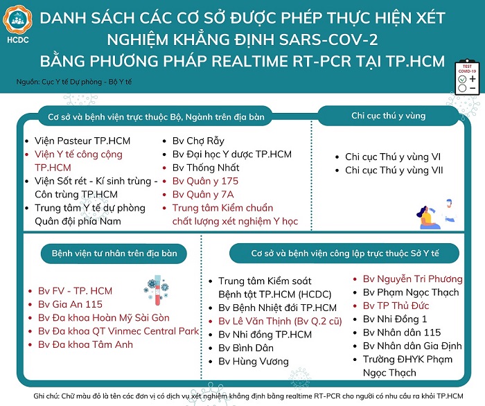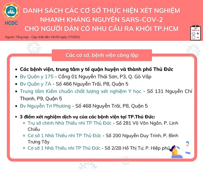Danh sách các đơn vị thực hiện xét nghiệm COVID-19 tại TP.HCM: Khi có nhu cầu rời khỏi thành phố cần thực hiện xét nghiệm SARS-CoV-2, người dân có thể liên hệ các bệnh viện để được xét nghiệm nhanh kháng nguyên hoặc phòng xét nghiệm của các đơn vị được Bộ Y tế cho phép xét nghiệm khẳng định SARS-CoV-2.
