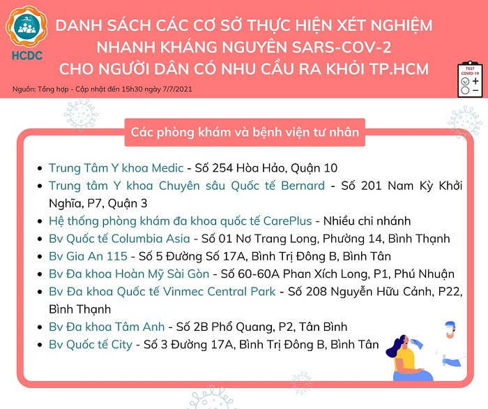 Thông tin cập nhật bởi Trung tâm Kiểm soát Bệnh tật TP.HCM (HCDC) tính đến 15h30 ngày 7/7.