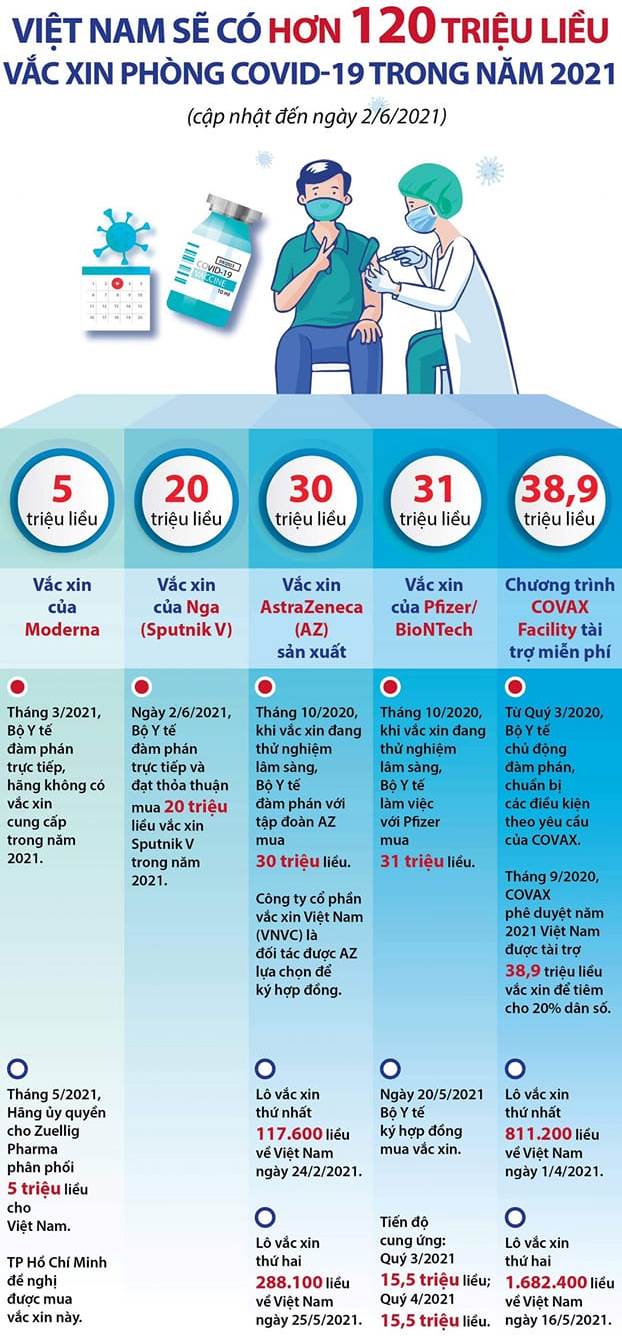 Theo đó, ngoài vaccine AstraZeneca, trong năm nay Việt Nam đã đàm phán để có thêm vaccine của Moderna (5 triệu liều), của Pfizer (31 triệu liều) và 20 triệu liều vaccine Sputnik V. Dự kiến trong năm 2021, Việt Nam sẽ có hơn 120 triệu liều vắc xin phòng Covid-19. Trong đó ngoài nguồn của Chương trình COVAX Facility, AstraZeneca, Việt Nam đã đàm phán để có thêm các nguồn vaccine khác. Cụ thể, hôm qua (2/6), Bộ Y tế đã đạt được thỏa thuận mua 20 triệu liều vaccine Sputnik V của Nga.