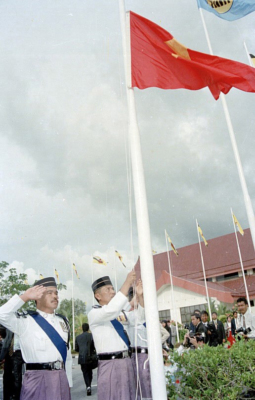 | Lễ kết nạp Việt Nam là thành viên chính thức thứ 7 của Hiệp hội các Quốc gia Đông Nam Á (ASEAN), ngày 28/7/1995 tại Thủ đô Bandar Seri Begawan (Brunei). (Ảnh: Trần Sơn/TTXVN) |