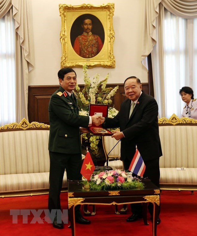 | Thượng tướng Phan Văn Giang chào xã giao Đại tướng Prawit Wongsuvon, Phó Thủ tướng Chính phủ, Bộ trưởng Quốc phòng Vương quốc Thái Lan. (Ảnh: Sơn Nam/TTXVN) |