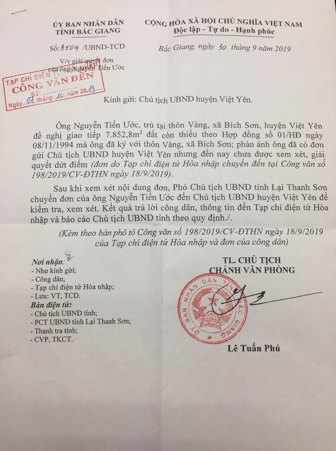 Sau khi nhận được công văn của tạp chí điện tử Hòa Nhập, ngày 30/09/2019 UBND tỉnh Bắc Giang đã có công văn số 3504/UBND-TCD gửi UBND huyện Việt Yên chỉ đạo giải quyết đơn thư ông Nguyễn Tiến Ước. Theo đó, Phó Chủ tịch UBND tỉnh Bắc Giang, ông Lại Thanh Sơn chuyển đơn của ông Nguyễn Tiến Ước đến chủ tịch UBND huyện Việt Yên để kiểm tra, xem xét. Kết quả trả lời công dân, thông tin đến Tạp chí điện tử Hòa Nhập và báo cáo Chủ tịch UBND tỉnh theo quy định.