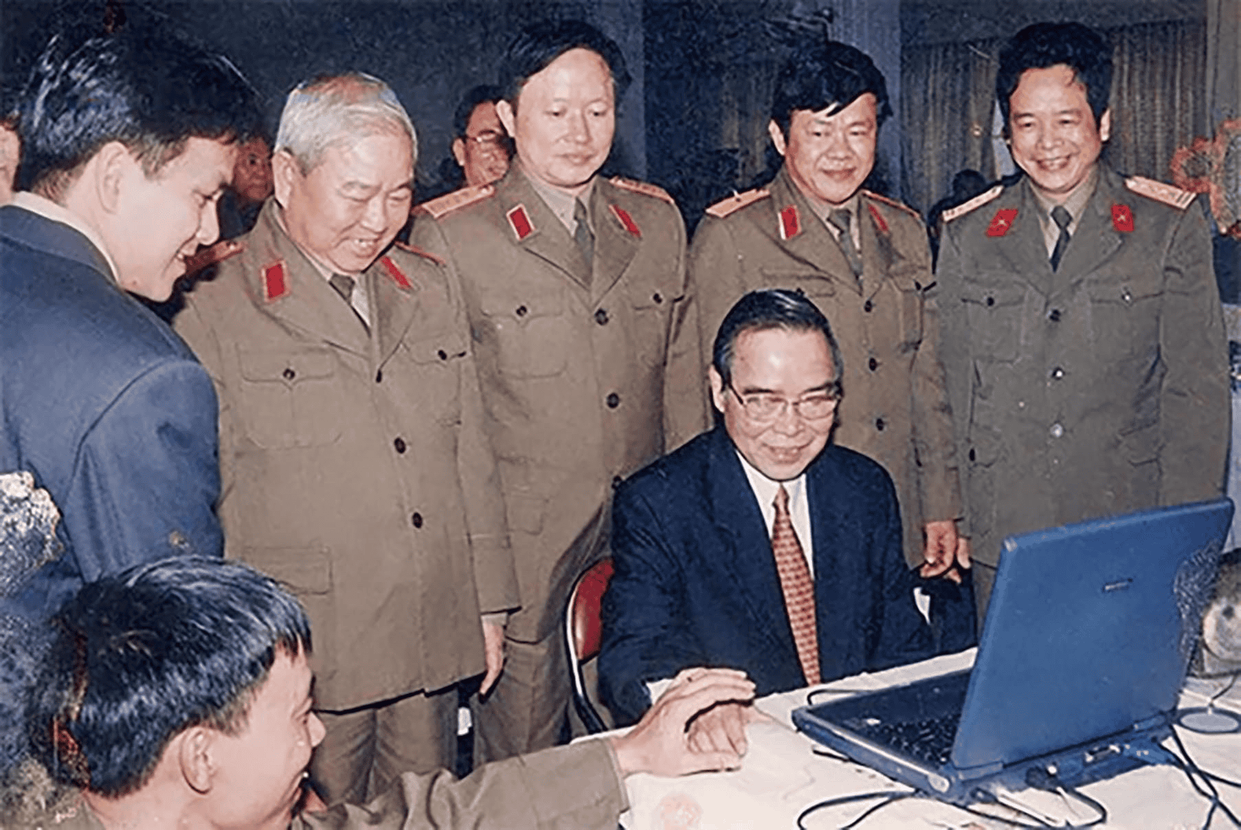 Thủ tướng Phan Văn Khải cùng tướng Hiệu dự ra mắt báo điện tử QĐND năm 2002 (Ảnh: NVCC)