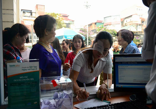 Chị Đỗ Thị Hội, tiểu thương kinh doanh 30 năm tại chợ Đồng Xuân là khách hàng đầu tiên chuyển tiền qua dịch vụ Bankplus với số tiền cao nhất ngày hôm nay.
