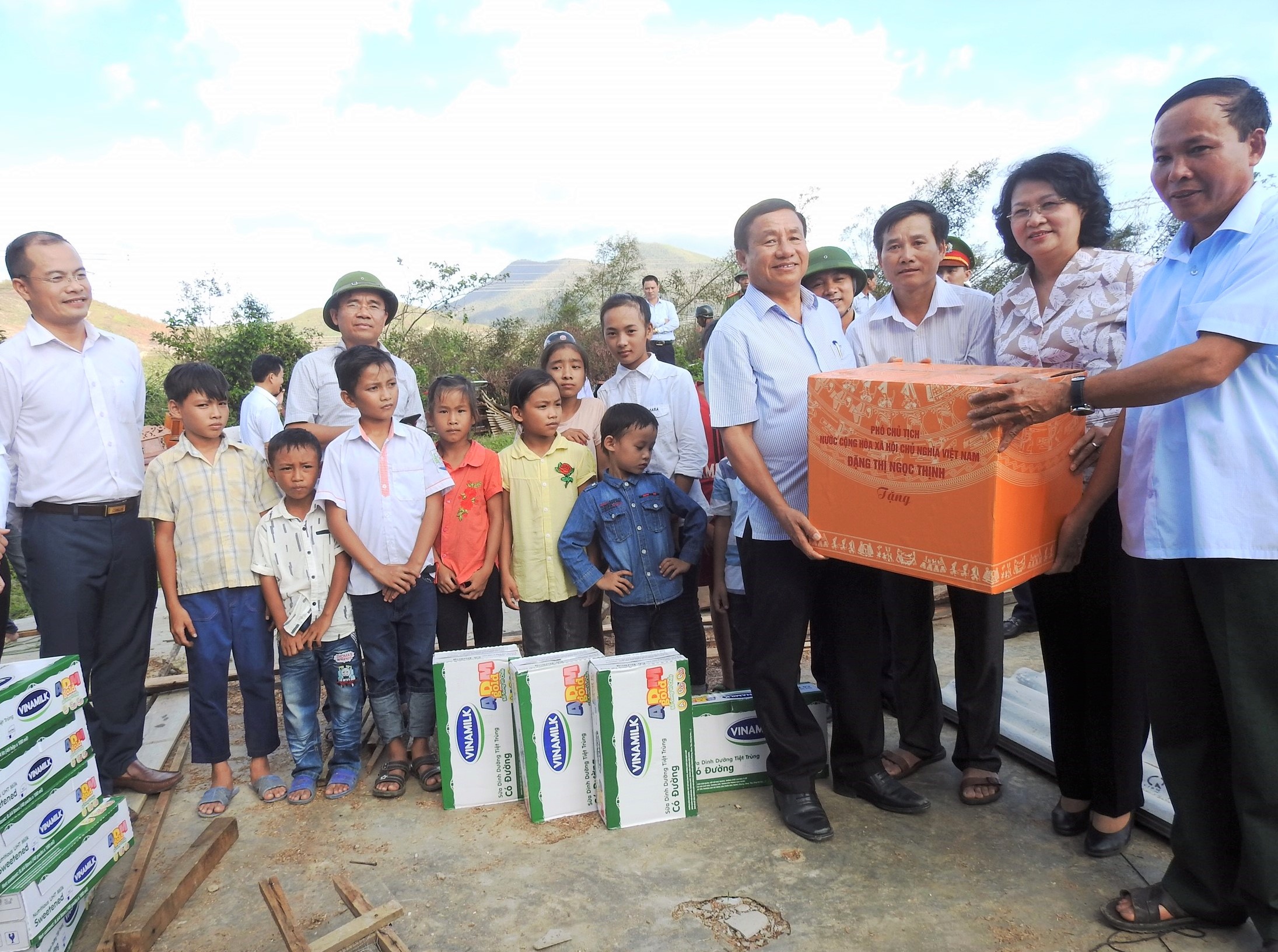 | Bà Đặng Thị Ngọc Thịnh – Phó Chủ tịch nước, Bà Lê Tuyết Mai, Phó Giám Đốc Quỹ Bảo trợ Trẻ em Việt Nam, ông Đậu Phi Tú – Giám Đốc Trang trại Vinamilk Hà Tĩnh và đại diện lãnh đạo tỉnh Hà Tĩnh đến thăm và tặng quà, sữa cho người dân và trẻ em vùng lũ xã Kỳ Lạc, huyện Kỳ Anh, Hà Tĩnh |