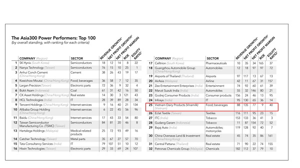 | Vinamilk xếp thứ 25 trong Top 100 của Bảng xếp hạng ASIA300 |