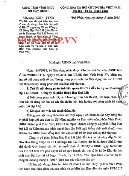 | Báo cáo kiểm tra dự án Flamingo Đại Lải Resort của Sở xây dựng tỉnh Vĩnh Phúc |