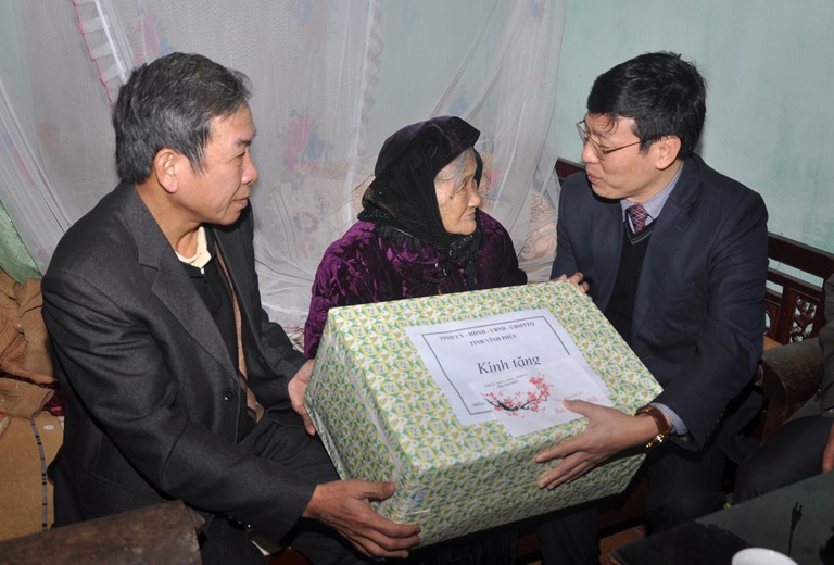 | Lãnh đạo tỉnh Vĩnh Phúc tặng quà cho mẹ Việt Nam Anh hùng Lê Thị Khuyên |