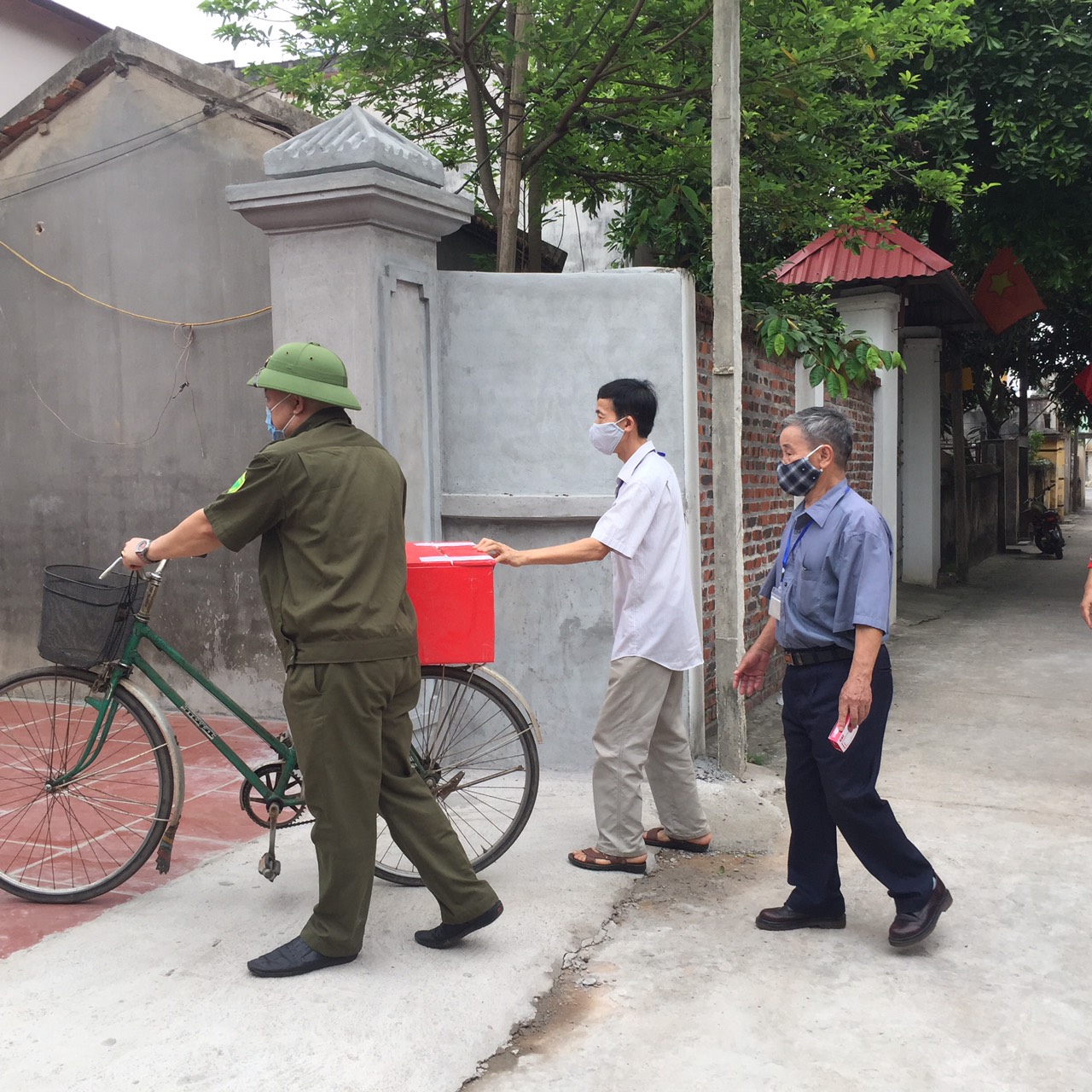 Hòm phiếu phụ của tổ bầu cử số 4 - phố bê tông xã đạo tú, huyện tam dương đến nhà cử tri là f2 đang thực hiện cách ly tại nhà.
