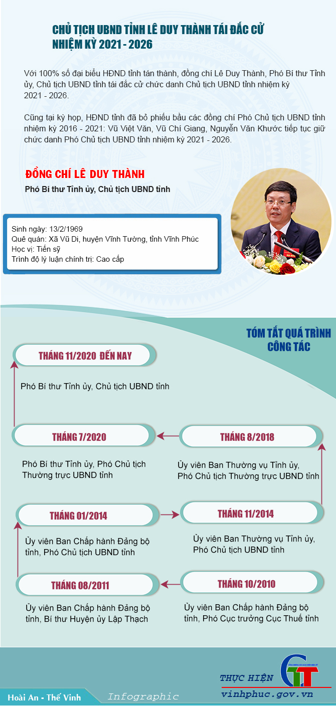 Tháng 10/2020, tại kỳ họp thứ 18 HĐND tỉnh Vĩnh Phúc khóa XVI, nhiệm kỳ 2016-2021, với số phiếu tuyệt đối, ông Lê Duy Thành được bầu giữ chức Chủ tịch UBND tỉnh khóa XVI, nhiệm kỳ 2016-2021