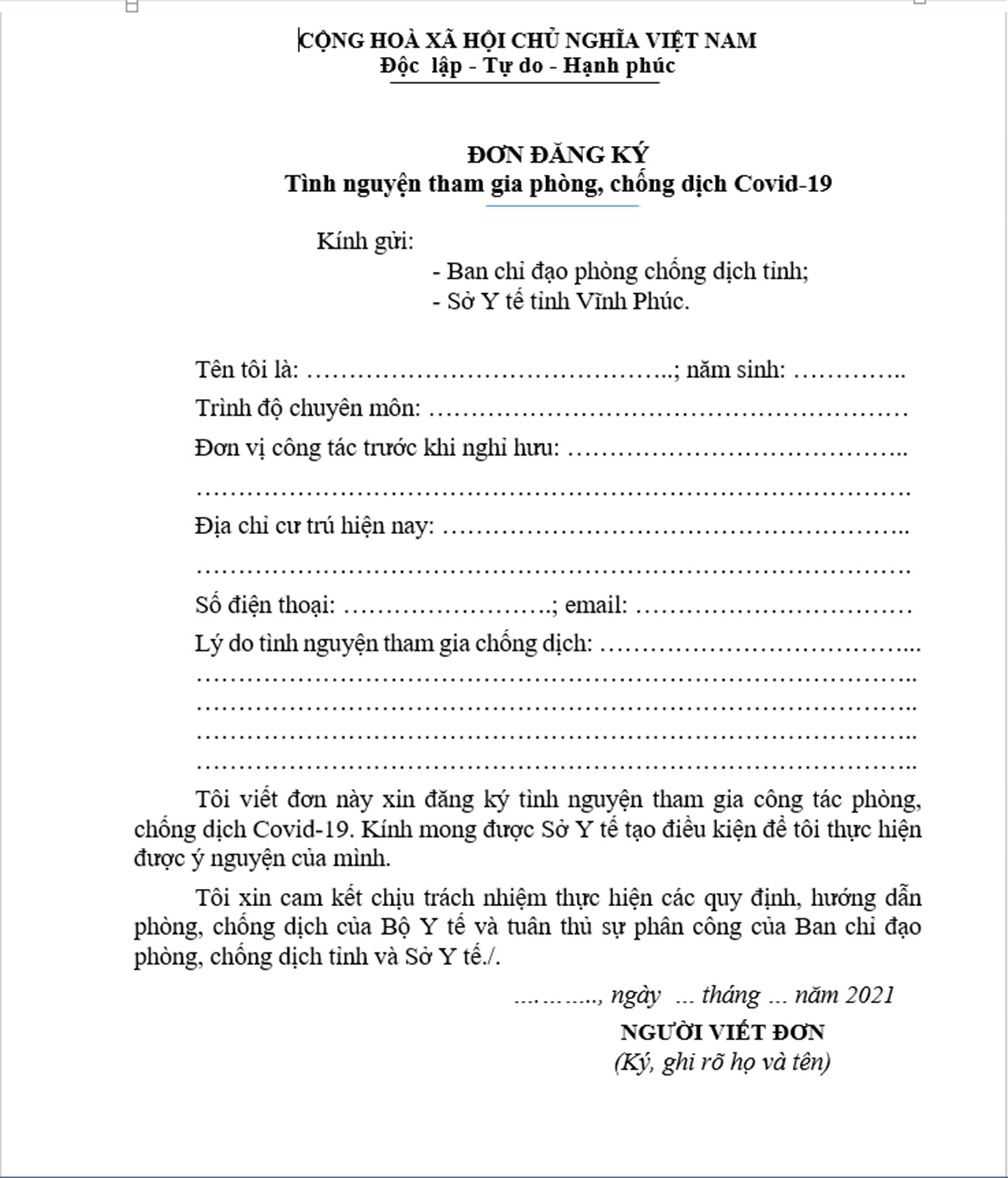 Mẫu đơn tình nguyện tham gia chống dịch Covid-19 dành cho cán bộ y tế đã nghỉ hưu ở Vĩnh Phúc.