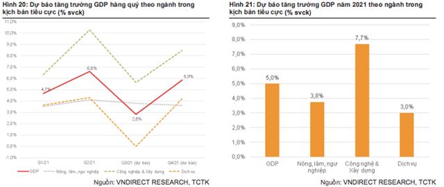 Trong kịch bản tiêu cực, tác động của đại dịch đối với lĩnh vực dịch vụ sẽ kéo dài và trầm trọng hơn, VNDIRECT dự báo ngành dịch vụ chỉ tăng trưởng 2,4% so với cùng kỳ trong 6 tháng cuối năm (so với 4,0% trong 6 tháng đầu năm 2021 và 3,2% trong kịch bản cơ sở). Ngành công nghiệp và xây dựng có thể phục hồi với tốc độ chậm hơn do sự gián đoạn chuỗi cung ứng toàn cầu và nhu cầu bên ngoài lẫn trong nước sụt giảm.