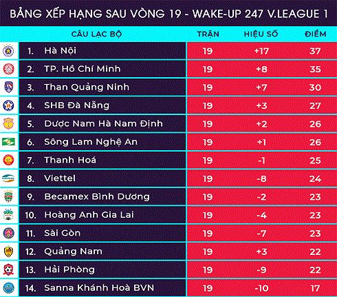 | Bảng xếp hạng V.League 2019 sau vòng 19. |