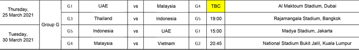 Tại bảng G, lượt trận thứ 7 (ngày 25/3) là cuộc đọ sức giữa Các Tiểu vương quốc Arab Thống nhất (UAE) và Malaysia. Cùng ngày, Thái Lan tiếp Indonesia trên sân nhà.