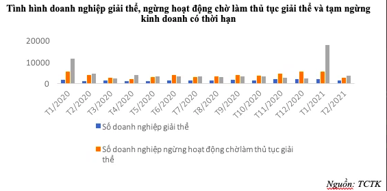 Lúc bình thường của thị trường thì việc ốm đau, dưỡng bệnh hay biến mất khỏi thị trường của doanh nghiệp cũng là chuyện bình thường. Trong vòng quay sinh tử của doanh nghiệp thì ở thời kỳ khủng hoảng của đại dịch covid 19, số ốm đau, dưỡng bệnh, biến mất lớn hơn số được sinh ra cũng không có gì lạ. 2 tháng đầu năm 2021, trên cả nước có 21.636 doanh nghiệp tạm ngừng kinh doanh có thời hạn, tăng 34% so với cùng kỳ năm trước. Bên cạnh đó, số doanh nghiệp ngừng hoạt động chờ làm thủ tục giải thể là 8.380 doanh nghiệp giảm 10,7%; số doanh nghiệp hoàn tất thủ tục giải thể là 3.595 doanh nghiệp, tăng 28,1% so với cùng kỳ năm trước, trong đó có 3.200 doanh nghiệp có quy mô vốn dưới 10 tỷ đồng, tăng 28,5%.