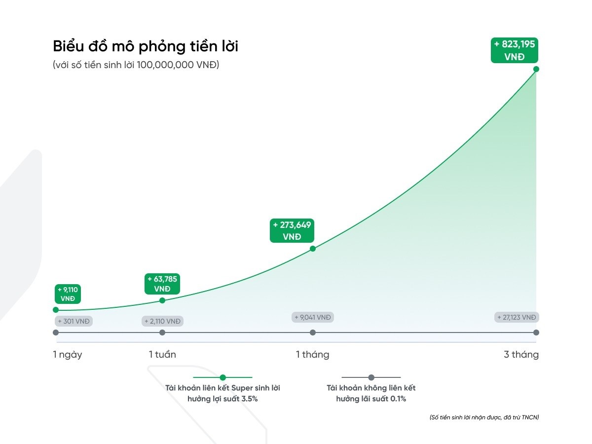Đây là tính năng giúp khách hàng tối ưu lợi nhuận từ số tiền nhàn rỗi có trong tài khoản với mức lợi suất vượt trội, cố định 3,5%/năm. So với mức lãi suất không kỳ hạn thông thường, “Super sinh lời” mang đến mức lợi suất đặc biệt tốt cho dòng tiền nhàn rỗi của khách hàng, giúp tạo hiệu quả tài chính khi có thể tự động tối ưu hóa dòng tiền, tự động sinh lời trong khi khách hàng không cần làm gì.