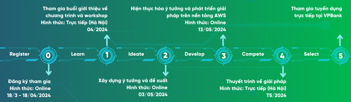 Sự kiện chính thức mở cổng đăng ký từ ngày 18/3 đến 18/4/2024. Người chơi sẽ tham gia chinh phục thử thách qua các vòng thi diễn ra trong tháng 4 và tháng 5/2024. Nhiều phần thưởng hấp dẫn và cơ hội tuyển dụng chính thức vào VPBank đang chờ đón những tài năng công nghệ có giải pháp xuất sắc nhất đáp ứng tiêu chí của chương trình.
