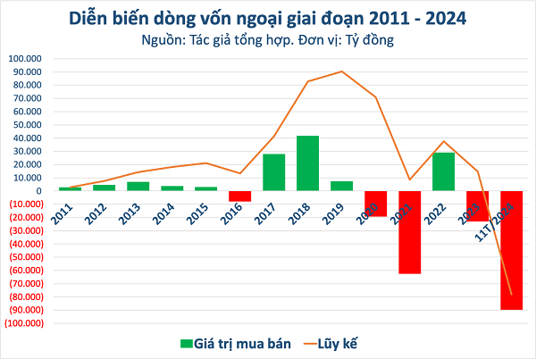 Về dòng tiền trên thị trường chứng khoán, câu chuyện chủ đạo trong năm 2024 là hiện tượng nhà đầu tư nước ngoài bán ròng kỷ lục bất chấp việc Việt Nam tiến gần hơn với mục tiêu nâng hạng theo tiêu chuẩn FTSE Russell sau khi gỡ bỏ quy định về ký quỹ trước giao dịch (prefunding). Trong 11 tháng, nhà đầu tư nước ngoài rút ròng gần 90.000 tỷ đồng khỏi chứng khoán Việt Nam và chưa có dấu hiệu dừng lại. Lực cầu đối ứng từ khối ngoại bán ra là nhóm nhà đầu tư cá nhân trong nước.