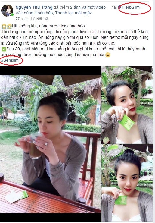 | Hình ảnh bà Nguyễn Thu Trang quảng cáo Sen Slim, dù sản phẩm này đang trong quá trình PC46 Hà Nội đang điều tra. Ảnh chụp màn hình facebook: Nguyen Thu Trang |
